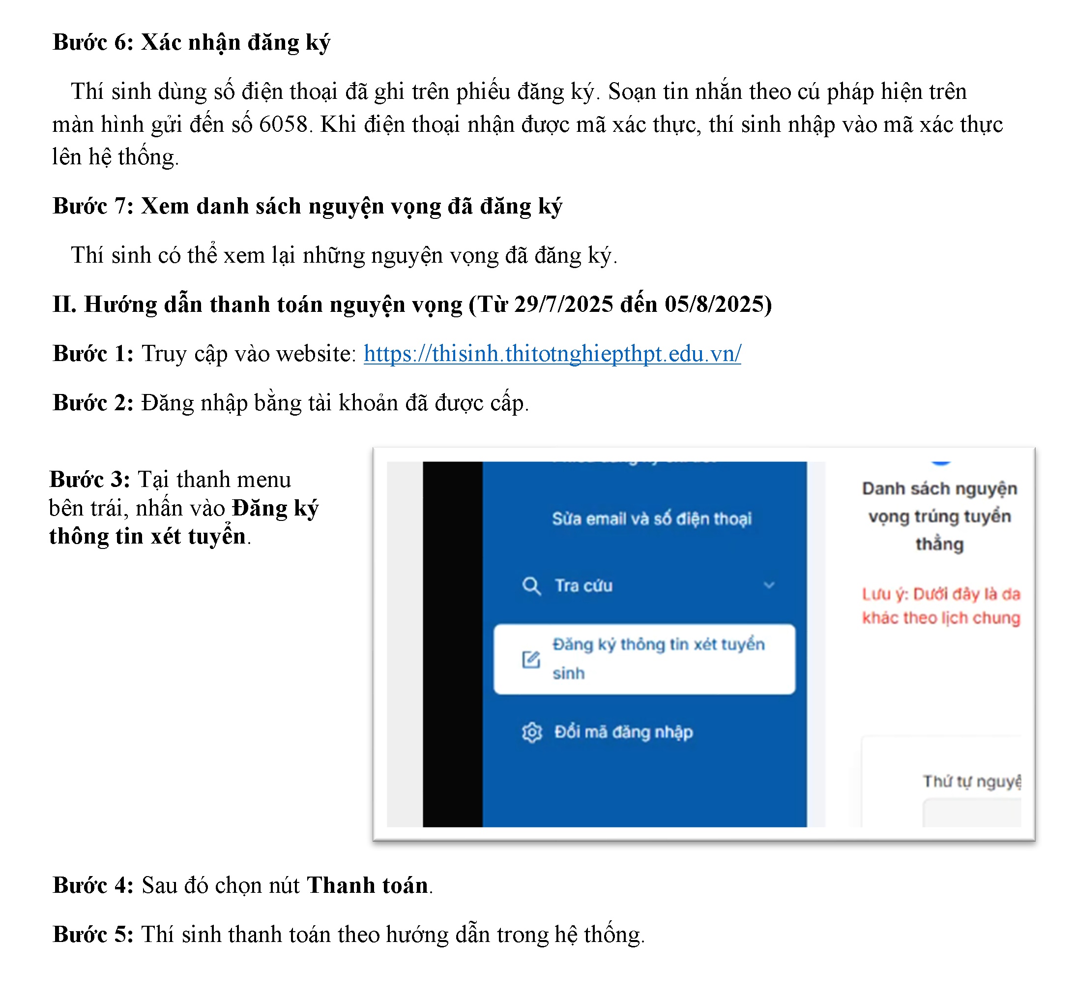 - Từ ngày 16/7/2025 đến 28/7/2025, thí sinh đăng nhập vào tài khoản đã được cấp và đăng ký nguyện vọng trên website https://thisinh.thitotnghiepthpt.edu.vn. Nếu cần Trường hỗ trợ thí sinh đến địa chỉ Trường Cao đẳng Cần Thơ: Số 413, đường 30/4, Phường Tân An, Thành phố Cần Thơ. Kết quả xét tuyển đợt 1 công bố ngày: 17h 22/8/2025.
