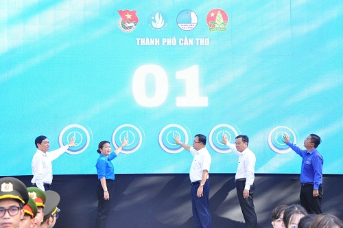 Các đại biểu thực hiện nghi thức ấn nút khởi động Ngày hội Thanh niên Cần Thơ năm 2025 – một hoạt động sôi động, nhiệt huyết và đầy ý nghĩa để hưởng ứng Chiến dịch Thanh niên tình nguyện hè năm 2025.